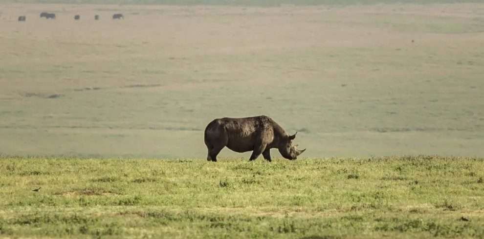 The crater floor is home to lions, elephants, rhinos, zebras, and flamingos.